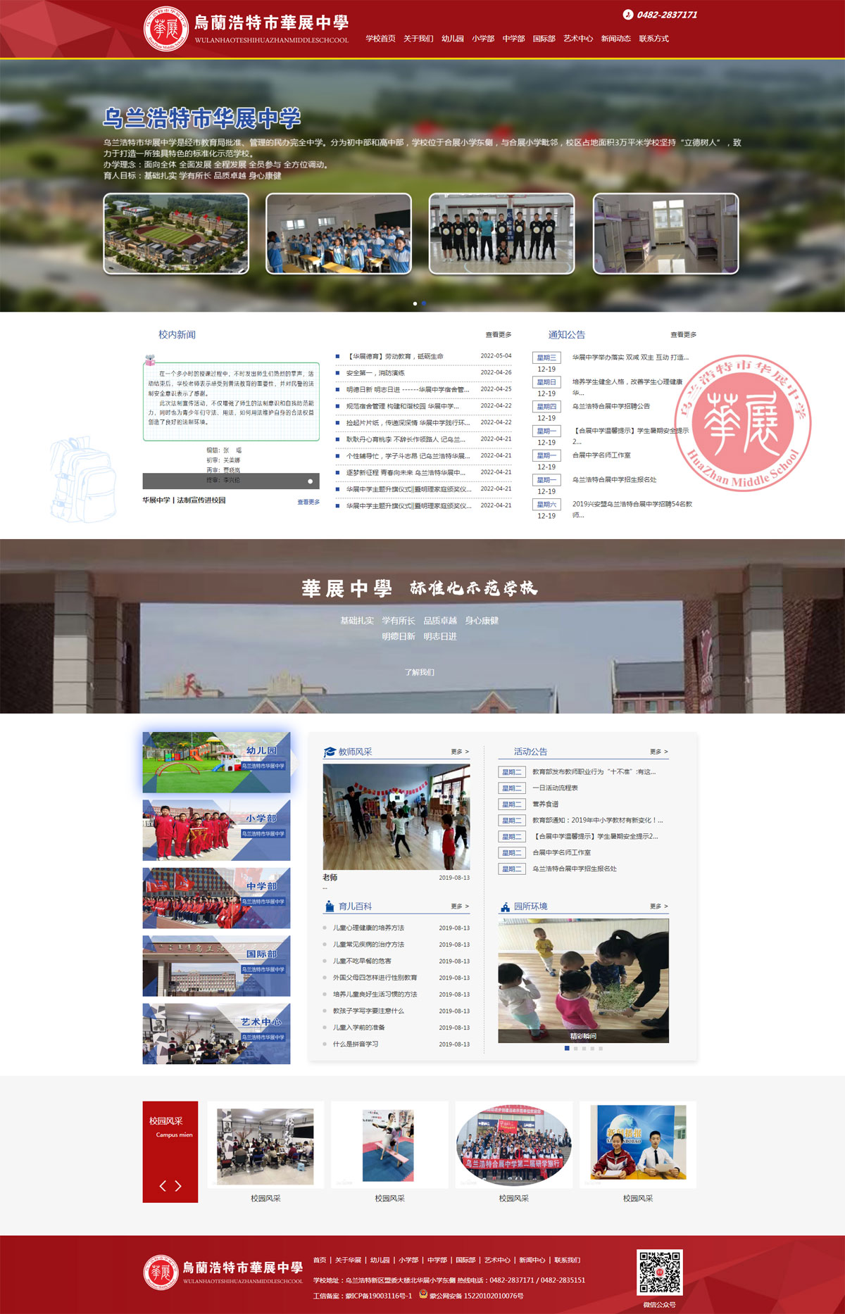 乌兰浩特华展中学是经市教育局批准并管理的民办完全中学。设有初中部、高中部和艺术中心。校区占地面积3万平方米,建有多功能教室、实验室、师生活动中心、学生公寓、食堂等配套设施,各类设施及场地均按照全区一流的现代化标准建造。学校坚持"立德树人",致力于打造一所独具特色的标准化示范学校。让学生在课堂中感受世界,让世界走进课堂。
