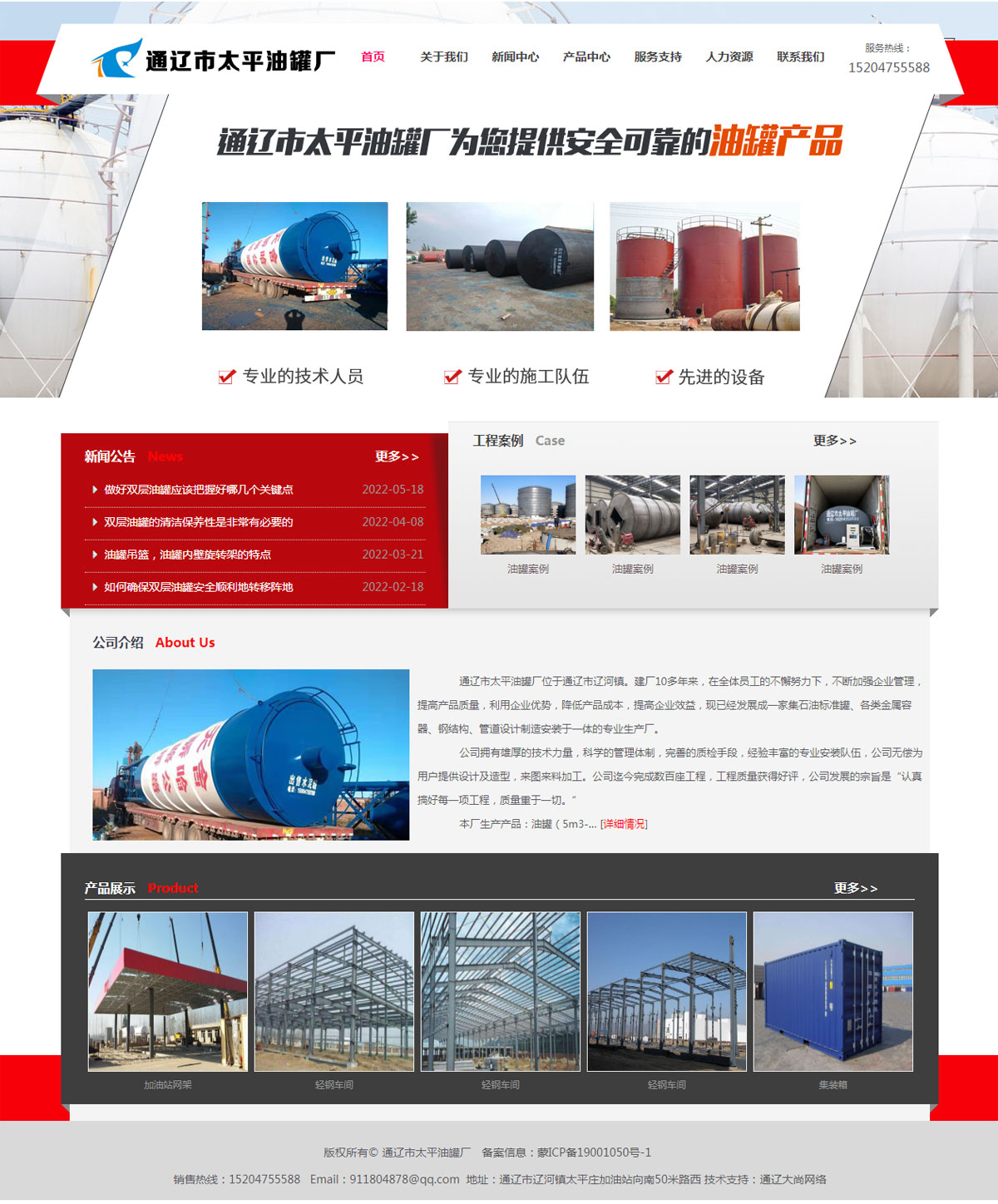 通辽市太平油罐厂位于通辽市辽河镇。建厂10多年来,在全体员工的不懈努力下,不断加强企业管理,提高产品质量,利用企业优势,降低产品成本,提高企业效益,现已经发展成一家集石油标准罐、各类金属容器、钢结构、管道设计制造安装于一体的专业生产厂。
